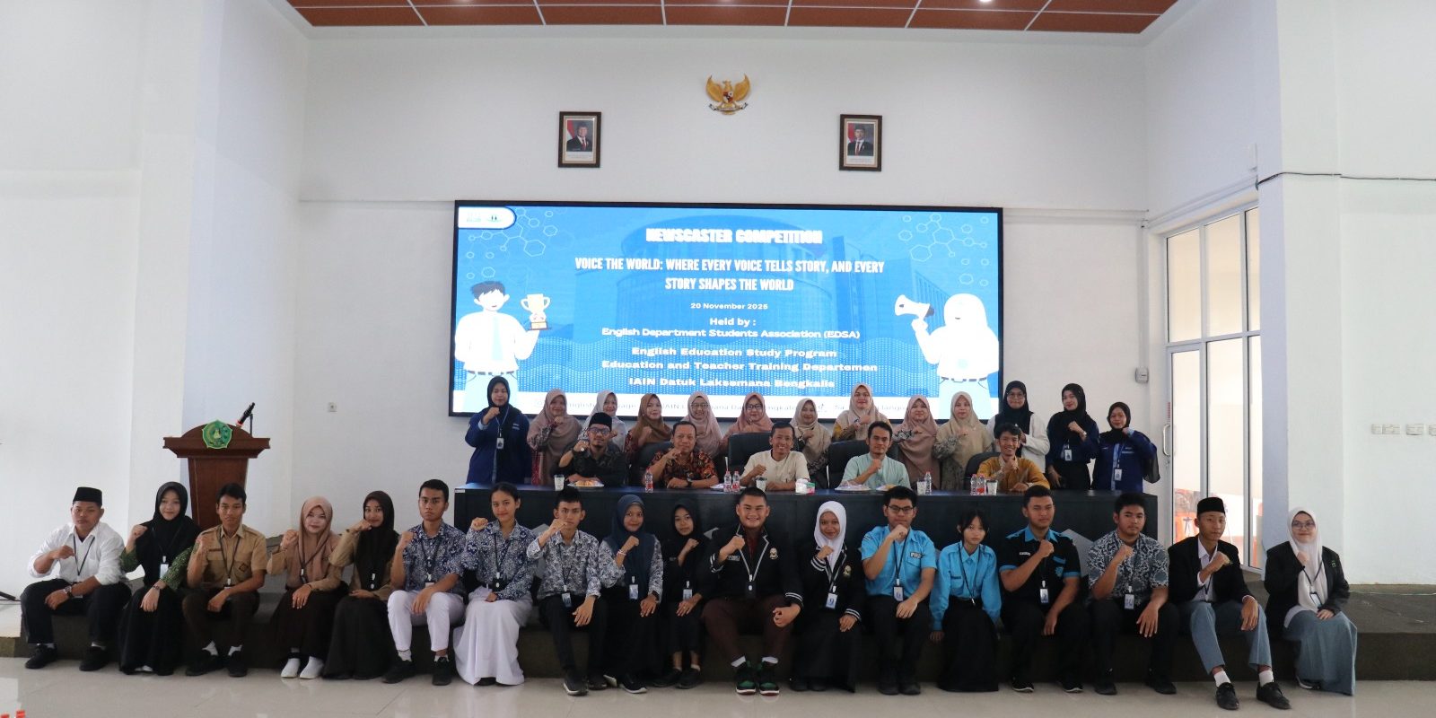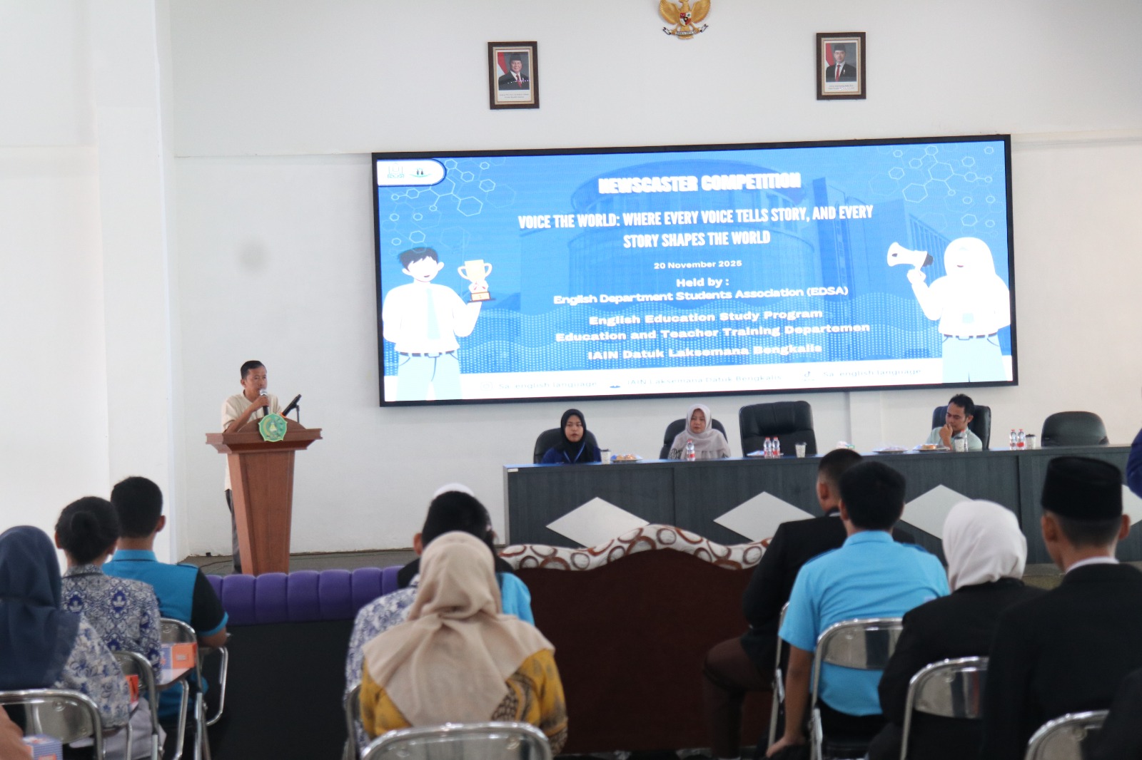 IAIN Datuk Laksemana Bengkalis (humas) Bengkalis – English Department Students Association (EDSA) IAIN Datuk Laksemana Bengkalis sukses menggelar Newscaster Competition. Kegiatan ini berlangsung di Gedung Layanan dan Pembelajaran Mahasiswa dengan mengusung tema “Voice the World: Where Every Voice Tells Story, and Every Story Shapes the World” pada Kamis, (20/11/2025).